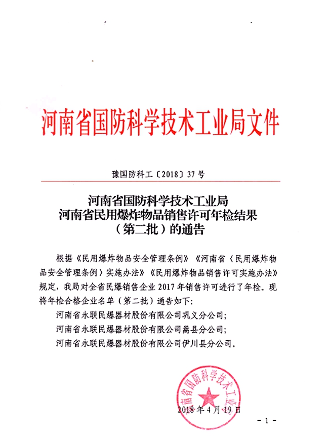 河南省民用爆炸物品销售许可年检结果(第二批)的通告